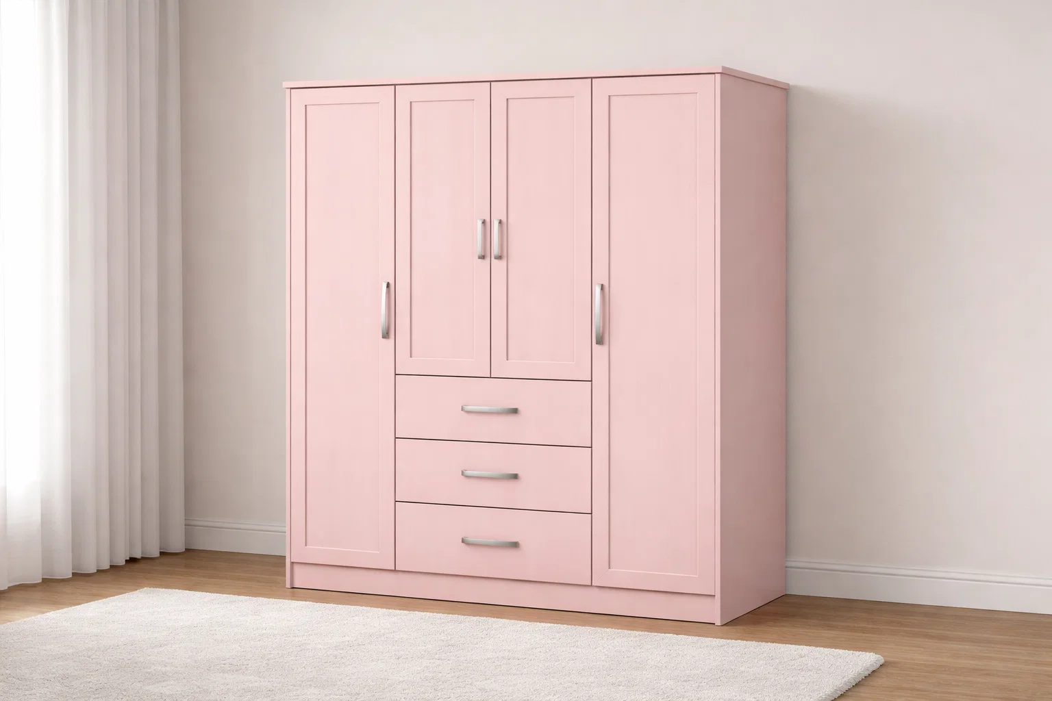 Kleiderschrank mdf rosa mit 3 türen und schubladen